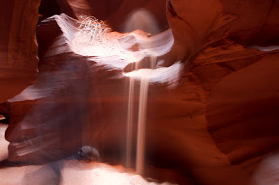 'Antelope Canyon was formed by erosion of Navajo Sandstone, primarily due to flash flooding and secondarily due to other sub-aerial processes. Rainwater, especially during monsoon season, runs into the extensive basin above the slot canyon sections, picking up speed and sand as it rushes into the narrow passageways. Over time the passageways are eroded away, making the corridors deeper and smoothing hard edges in such a way as to form characteristic 'flowing' shapes in the rock.
